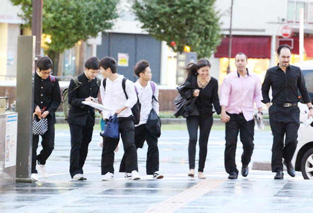 強風にあおられながら目的地へ急ぐ人たち(豊橋駅前で)