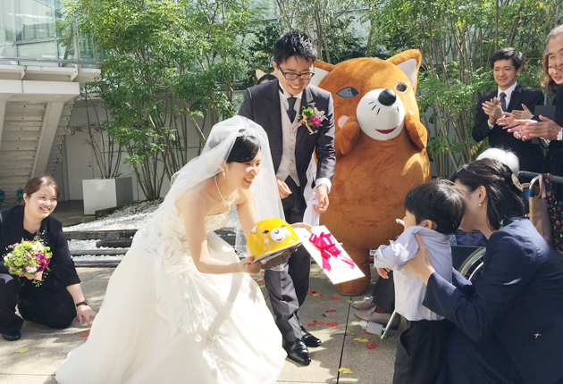 いなりんグッズを参列した子供に渡す花嫁ら(豊川市提供)