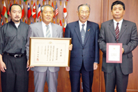 文部科学大臣表彰を手に白井市長と喜びあう山内会長ら(田原市)