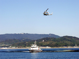 ダミーの遭難者をつり上げる海上保安本部ヘリ