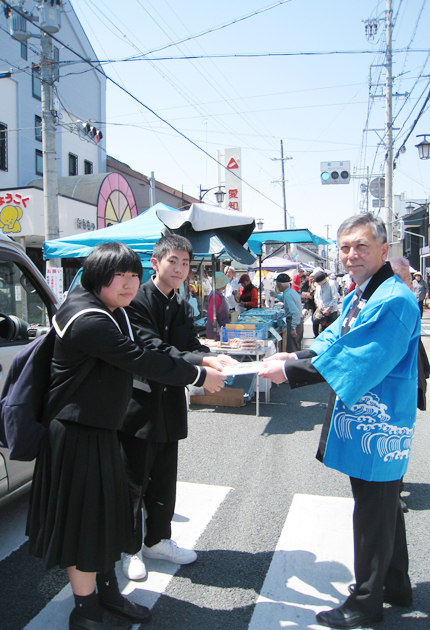 税務署の鶴山裕一署長から啓発セットを受け取る高校生ら(新城市の中央通り商店街で)