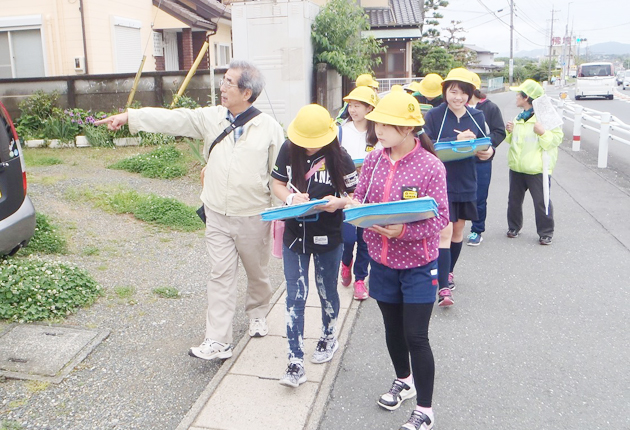 校区をまち歩きする磯辺小の児童ら(市防災危機管理課提供)