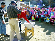 豊橋市野依保育園(菊池武顕園長、園児230人)で15日、地元老人クラブ(安達正光会長)協力による恒例のモチつきがあり、園児たちはつきたてのモチをあんころモチやきな粉モチにして賞味した。 モチ米は野依町南郷の前田勝芳さん(元老人クラブ会長)...
