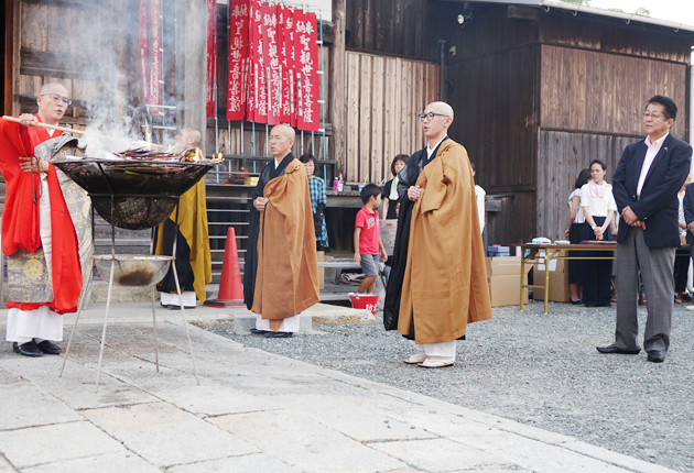 箸供養を見守る藤本社長(右端)=龍拈寺で