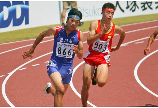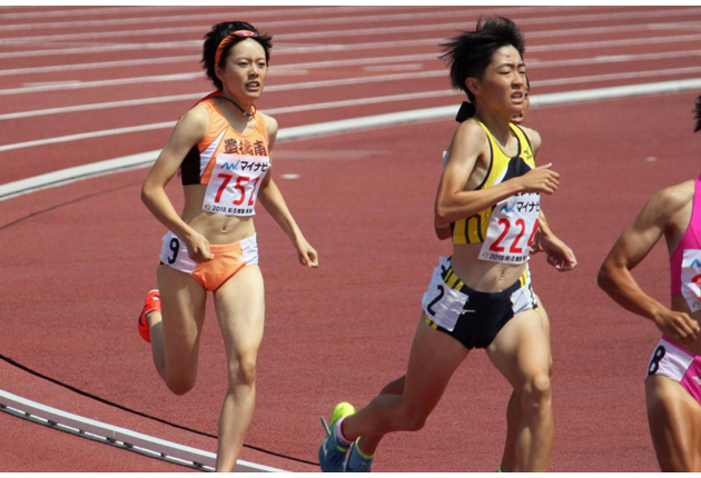全国トップレベルの選手たちを必死に追走する豊橋南の相場里咲㊧(三重交通Gスポーツの杜伊勢陸上競技場で、提供)