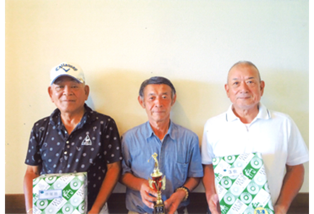 優勝した柴田敏夫さん㊥と準優勝の伊藤直幸さん㊧、3位の藤野公司さん(三の輪ゴルフ提供)