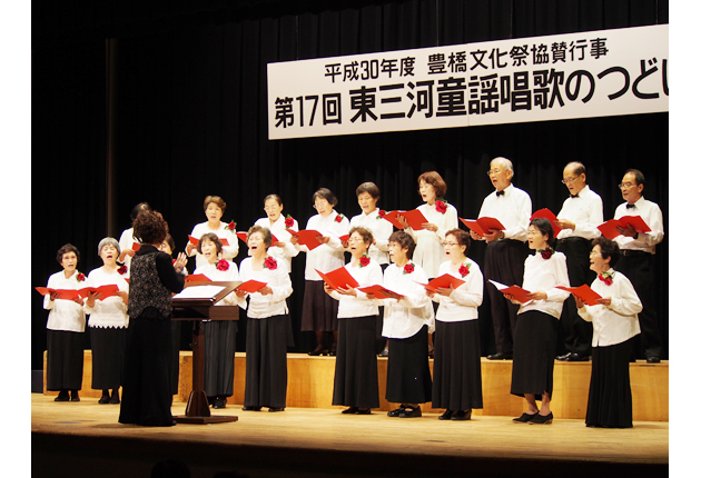 東三河童謡唱歌の会(伊藤健司理事長)は9日、豊橋市八町通の市公会堂で「東三河童謡唱歌のつどい」を開いた。約600人が訪れ、歌声に聴き入った。豊橋文化祭協賛行事で、東海日日新聞社などが後援した。 出演したのは豊橋、豊川、蒲郡、新城市の4市で...