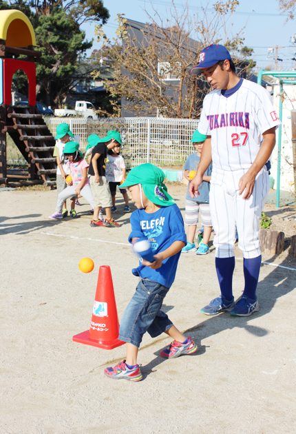 部員の手ほどきで力いっぱいボールを打つ園児(豊川市中条町で)