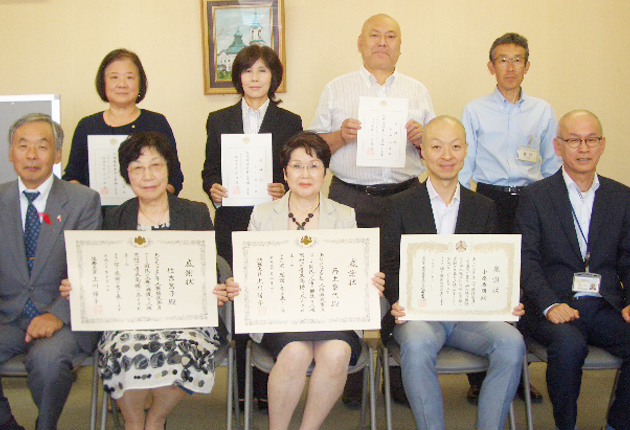 感謝状を受け取り退任した前列の3人、委嘱状を受け取り、新任した後列3人(提供)