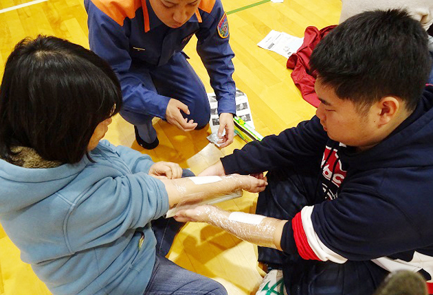 応急救護講習を受ける子どもたち(衣笠市民館で=提供)