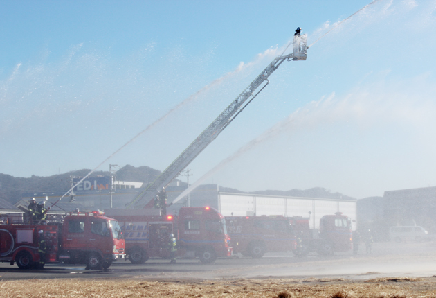蒲郡市の「消防出初め式」が13日、市内港町の竹島ふ頭で行われた。市消防本部の職員など約480人と車両31台が参加して、新年の無事故無災害を祈願した。 消防職員は、不審者が液体を散布するテロ事件を想定した「特殊災害対応訓練」を披露。市ジュニ...