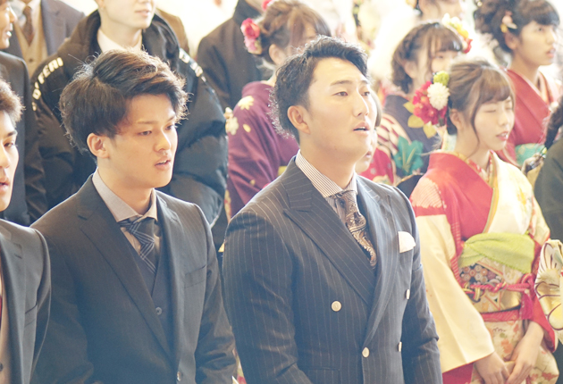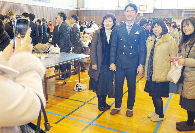 成人式に臨む藤嶋健人投手(中央)=豊橋市栄小学校で