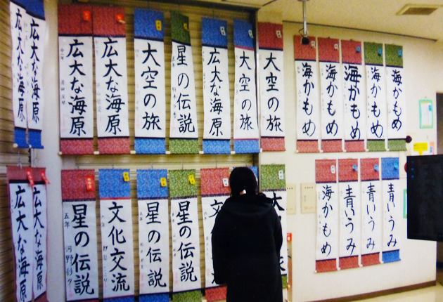 豊橋市西幸町の豊橋信用金庫幸支店(佐々木敦基支店長)ロビーで15日まで、近くの日本習字教室(中川敏子主宰)が書き初め展を開いている。 作品は毛筆で画仙紙にしたため、小学2年から中学1年までの27点が展示されている。小学生は「青いうみ」や「...