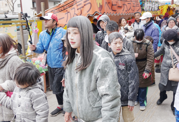赤鬼に頭をなでてもらう(豊橋市八町通で)