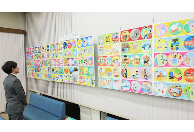 ロビーを彩る絵画作品展(豊川信用金庫三ノ輪支店提供)