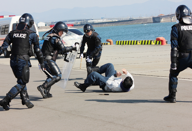 テロリスト役を追い詰める機動隊(豊川市御津町で)