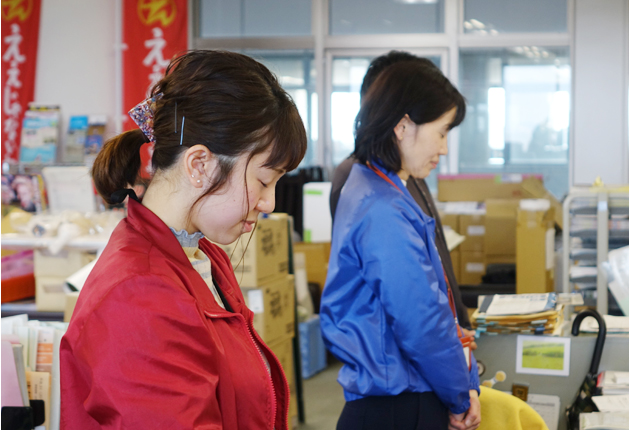 東日本大震災の発生時刻に合わせ黙とうする職員(豊橋市役所で)
