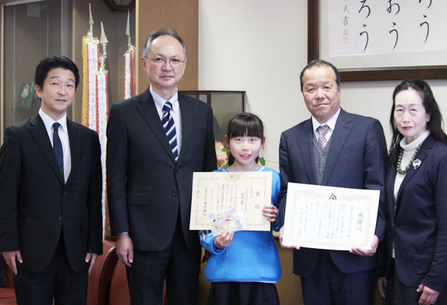 東三河法人会は11日、田原市野田小学校で、「税に関する絵はがきコンクール」で最優秀賞の「税務署長賞」に輝いた同校6年の鬮目(くじめ)菜々花さん(12)に表彰状を贈った。鬮目さんは「気持ちを込めて書いた作品。すごい賞をもらえてうれしい」と喜...