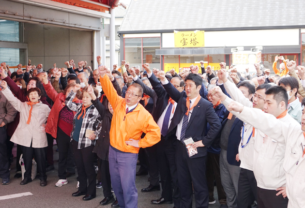 県議選の出発式で「頑張ろう」と気勢を上げる支持者ら(豊橋市内で)