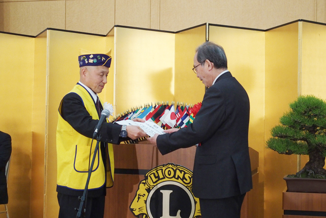 山脇市長に寄贈品の目録を渡す渡邊副会長㊧(豊川市民プラザで)