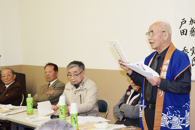 小林名誉会長㊨とパネラーの皆さん(新城市設楽原歴史資料館で)
