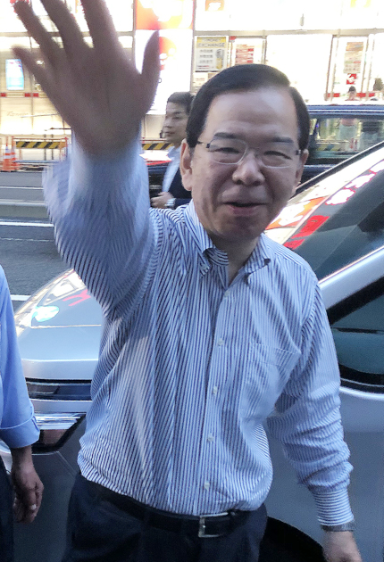 街頭演説会に集まった人たちに手を振る共産党の志位委員長㊨