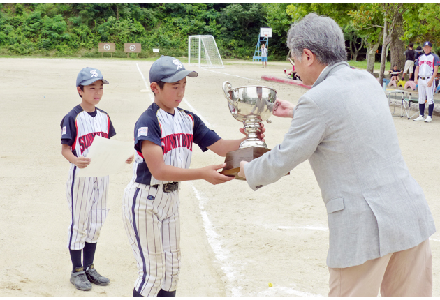蒲郡信用金庫の岩瀬専務理事が優勝杯を授与した(蒲郡市三谷東小学校グラウンドで)