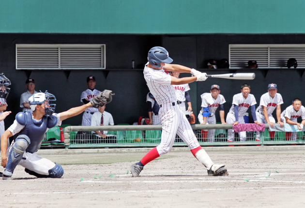 豊川は執頭が7回に意地の2塁打を放ち2点差まで詰め寄った(同)