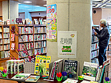 花装飾を施した中央図書館内で盛んな春の限定コーナー
