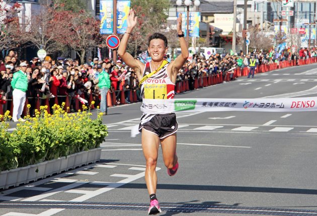 自身初のアンカーを務めた服部勇馬がトップでフィニッシュした(田原市田原町はなとき通りで)
