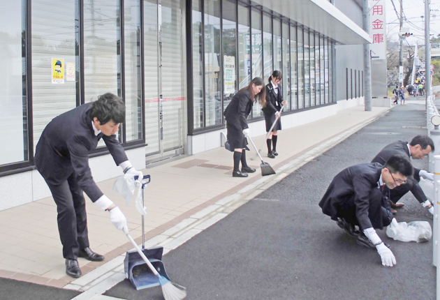 支店周辺を清掃する職員(豊橋信用金庫大岩支店で)