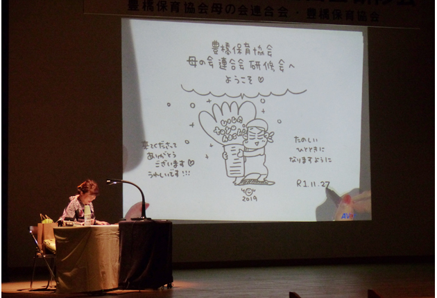着物姿で漫画を描きながら話す独特のスタイルで人気の、育児漫画家でイラストレーターの高野優さんの子育て講演会が27日、豊橋市八町通の市公会堂で開かれた。 豊橋保育協会(市川順敬会長)と同協会母の会連合会(松田伊代会長)が2019年度の研修会...