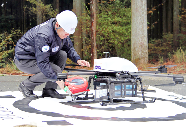 愛知県が8月下旬から実施しているドローン(無人飛行機)社会実装事業の実証実験が27日、新城市作手の老人憩いの家から約1・7キロ先の山間部までの区間で行われた。県内で初の試み。内閣府の近未来技術等社会実装事業「産業首都あいち」が進めている近...