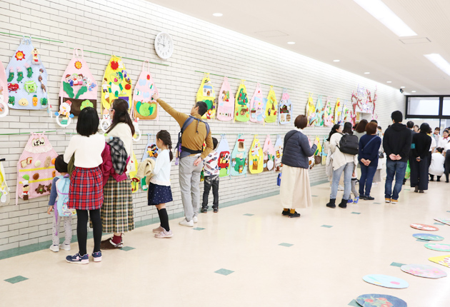 色とりどりの楽しい作品に見入る親子づれ(同)