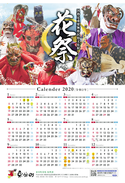 東栄町では、町内各地区で開催される各種イベントなどをまとめた2020年の観光カレンダーを発売している。 新たに作製された2020年のカレンダーは、昨年に続いて「花祭」をメインテーマとし、町内10地区の花祭保存会から「茂吉鬼」と「朝鬼」が集...