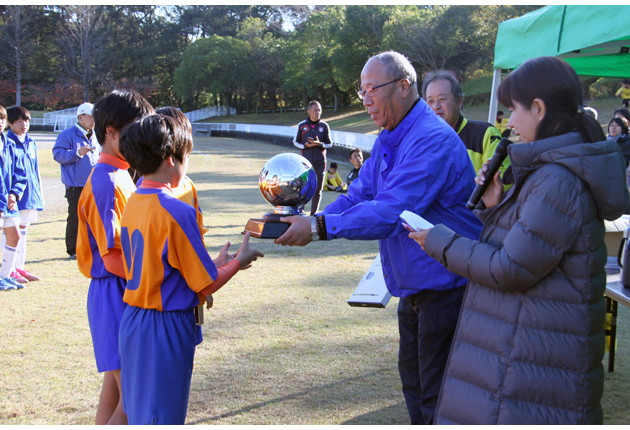 新城RCの夏目会長から優勝杯が手渡された(新城総合公園陸上競技場で)