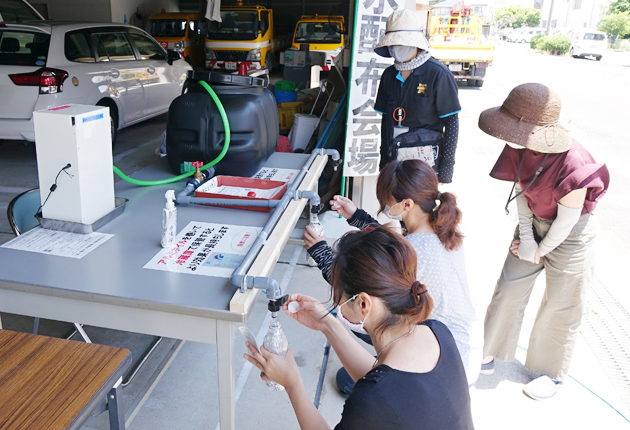 複数の蛇口から出る次亜塩素酸水をボトルに入れる市民(一宮支所で)
