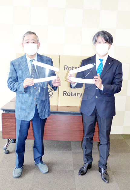 フェイスシールドを寄付した豊橋東RCの居平会長㊨と安井会長(豊橋市中野町の市医師会館で)