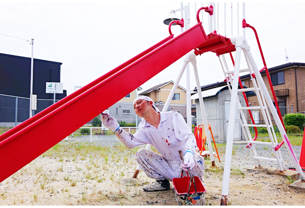 滑り台の上塗りをする金田さん(大崎児童遊園で)