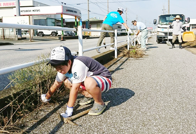 道路沿いの雑草を抜き取る清掃活動の参加者