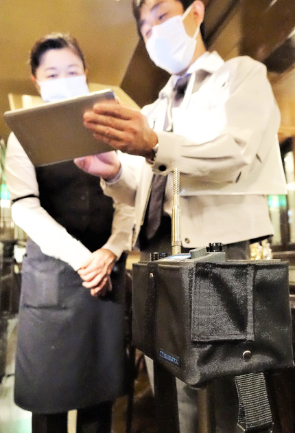 装置(手前)の測定結果をもとに、店の関係者(左)に対策を助言する保健所職員