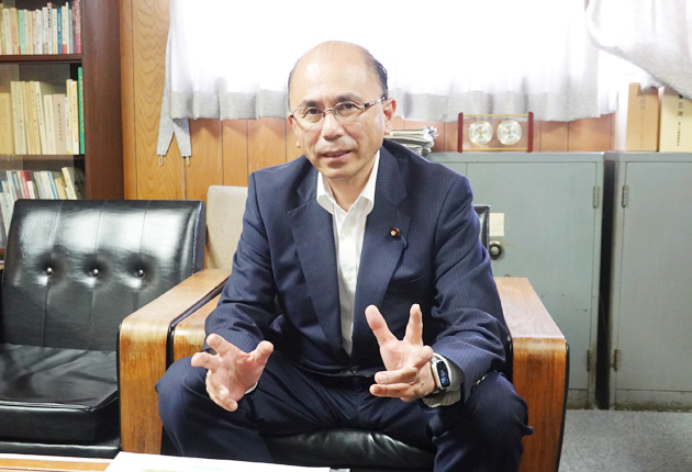 防災道の駅選定とIC整備について報告する根本氏(東海日日新聞社で)