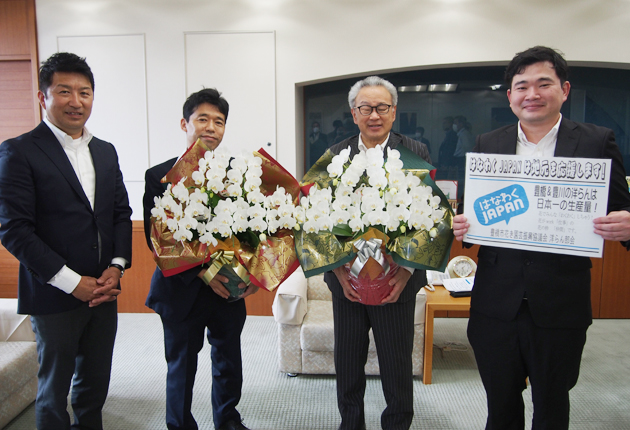 20日の「父の日」を前に、豊橋市花き園芸振興協議会の洋らん部会は11日、市の浅井由崇市長と山西正泰教育長、田中敏一市議会議長にそれぞれコチョウランを贈った。 部会の寺部浩章部会長、伊藤敬志さん、北谷淳史さんの3人が市役所を訪れ、市長らに白...