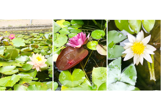 左から、ピンク色と淡い赤色のスイレンが仲良く咲く「友情」、オールモストブラックの「存在感」、「主役」が似合う熱帯スイレン(法光院で)