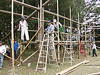 昔の記憶をたどりながら、たる木と竹を荒縄で縛り上げて小屋を掛ける会員たち