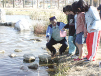 1000匹のメダカを池に放流する子供たち
