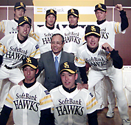 王監督を囲み新入団選手8人がそろう。後列右から2人目が森福投手