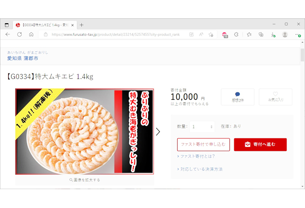蒲郡市の返礼品で人気が上昇した「特大ムキエビ」(「ふるさとチョイス」から)