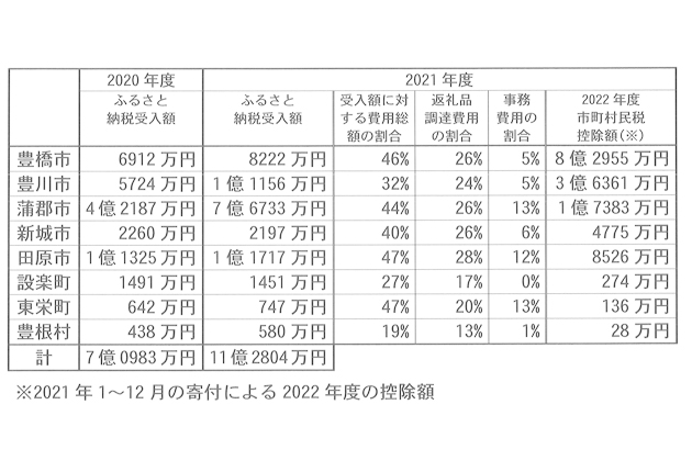 【表】東三河自治体のふるさと納税実績(総務省発表資料から抜粋)
