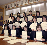 満面の笑顔で合格証書を手にする生徒たち(豊橋商業高校で)